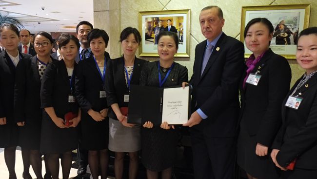 9月5日下午,土耳其總統埃爾多安離開酒店前,對杭州維景的服務深表滿意,在眾多媒體的關注下,為杭州維景簽名留念,并與管理人員合影,感謝杭州維景提供的溫馨、細致、周到的服務,同時盛情邀請酒店員工去土耳其觀光游覽。