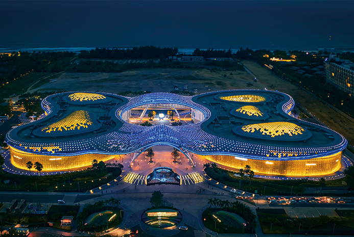 三亞國際免稅城建筑設計靈感源于有著“國艷”之稱的海棠花,采用世界知名建筑設計公司打造的連續空間曲面鋼結構,如同一朵嬌艷的“海棠花”盛開在蔚藍海岸線。由國際知名室內設計團隊傾力打造的室內空間,也將藝術群落與時尚元素巧妙的結合起來。不論是美輪美奐的“海棠”夜景,還是獨具匠心的室內設計,都將為游客帶來獨特的視覺刺激、感官沖擊和豐富的購物享受。