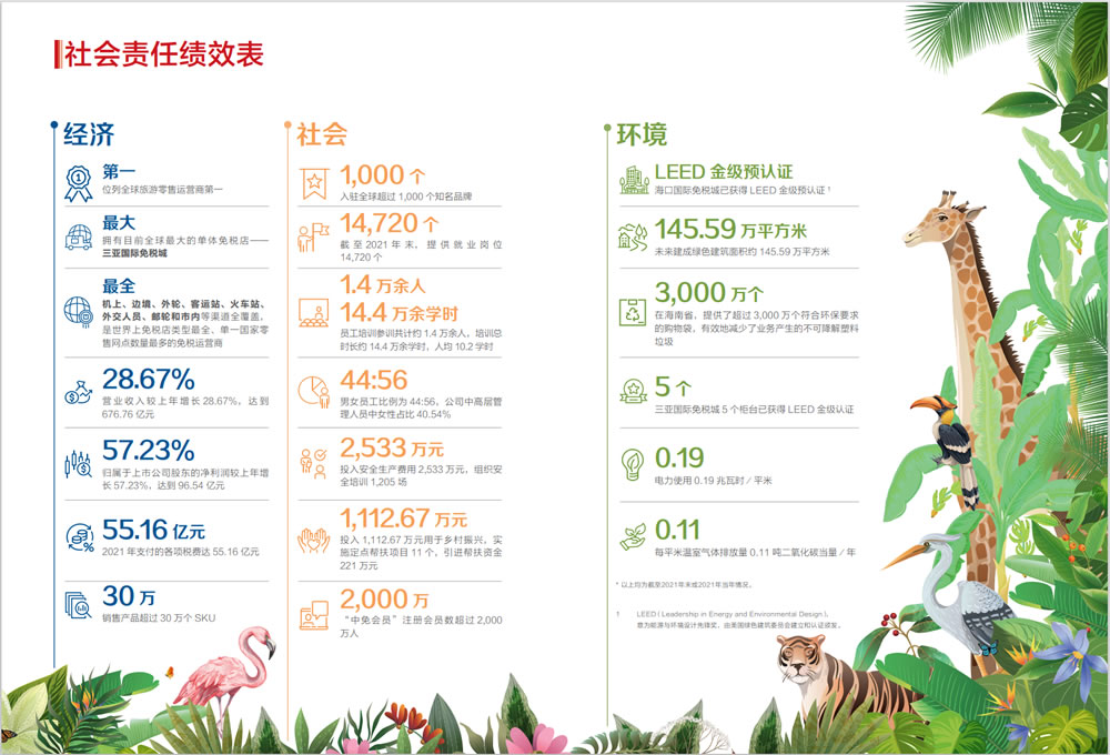 7月18日,中國旅游集團中免股份有限公司以中英文雙語的形式,披露了公司上市以來的首份ESG報告——《2021年度環境、社會及管治報告》。公司以不斷滿足消費者日益增長的對美好生活的追求為使命,在推動公司高質量發展的同時,積極以行業道德行為和成果貢獻回饋社會,成績斐然。